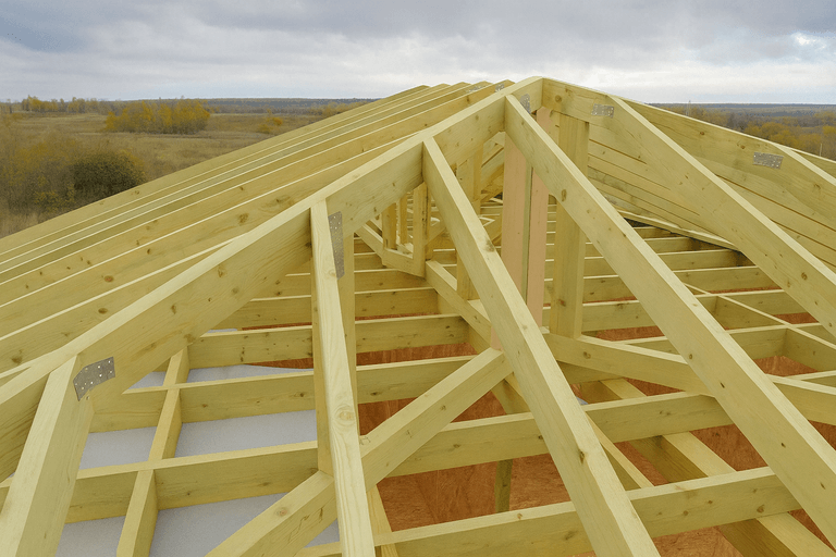 Мы проектируем и монтируем стропильную систему с учетом снеговой и ветровой нагрузки. Это обеспечивает прочность, устойчивость и долговечность крыши.
